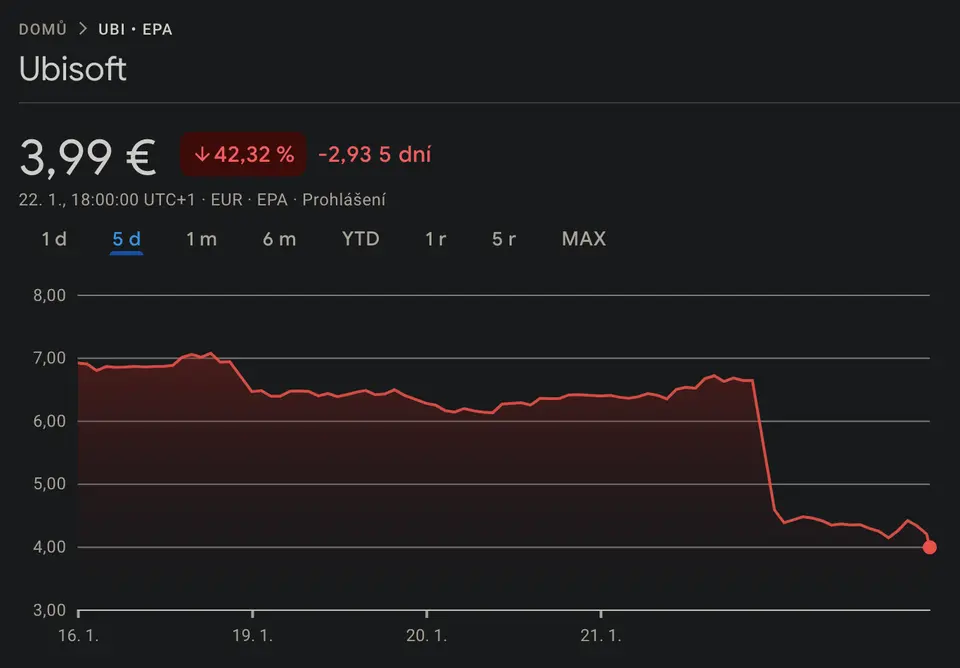 Ubisoft v krizi: Akcie francouzské společnosti zaznamenaly dramatický propad