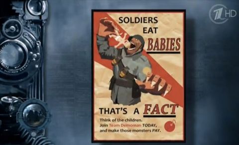 Když před několika lety Valve spustilo kampaň, ve které se hráči měli přidat na stranu Soldiera nebo Demomana při jednom z updatů, fanoušci byli vyzváni k vytvoření fanartu propagující tu či onu stranu. Uživatel TankTaur z DeviantArt přispěl třemi povedenými plakáty, které se inspirovaly estetikou plakátů první poloviny dvacátého století... a tím by to skončilo, kdyby někdo v ruské televizi dával větší pozor při sběru materiálů.